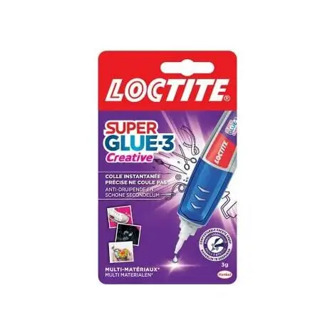- Emballage – Loctite Super Glue-3 Creative, Colle extra forte ergonomique avec applicateur prĂ©cis, Colle cyanoacrylate transparente au format stylo, 3 g.