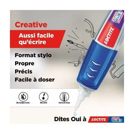 - Emballage – Loctite Super Glue-3 Creative, Colle extra forte ergonomique avec applicateur précis, Colle cyanoacrylate transparente au format stylo, 3 g.